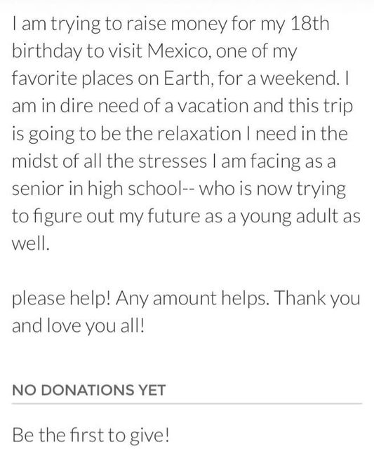 Personally I've only ever seen gofundme's for funerals, freak accidents, ect. but today my cousin shared a friends post and it popped up on my feed... I was shocked. I had to share lol. The whole idea is so tacky!