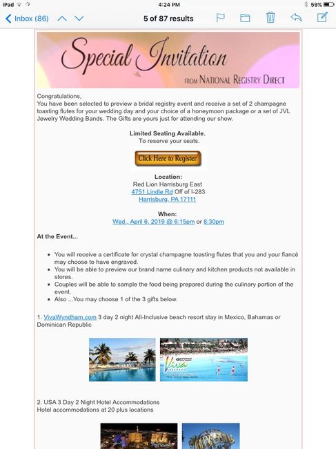 So I went to the "Dinner-4-Two" cookware meeting and we got the free wedding bands and sent off for the champagne glasses, but we have not received the glasses yet. We ordered them months ago and haven't heard from the company or anything. I can't remember what the company is, I wanted to call and ask if they even received our order?? Does anyone know what the company name is? Or did anyone order them and actually receive them in the mail??