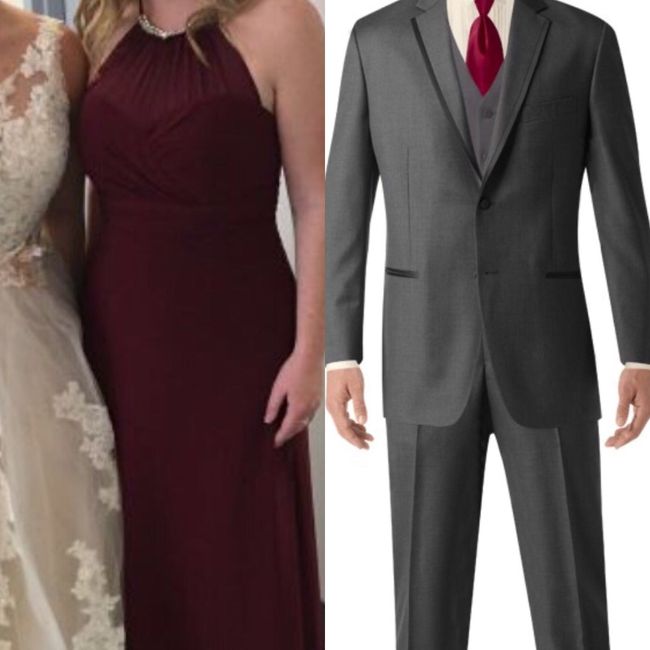 Bridesmaids are in burgundy. Flowers are burgundy, pink and gold. He prefers a black tuxedo, as do I. Where we are lost is with the vest and tie. He wants color. Will burgundy be too prom like? Grey will bring in a color that is not anywhere else. A co-worker said that FH should have white vest. It's all confusing me. We are older and I want a classic look but stylish look. Can anyone give direction and/or post pics for idea?