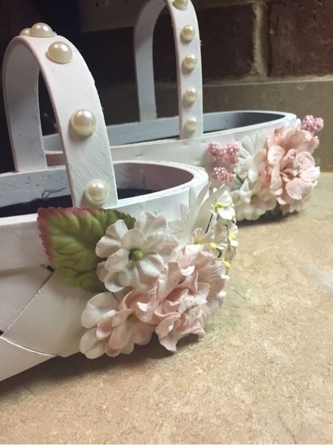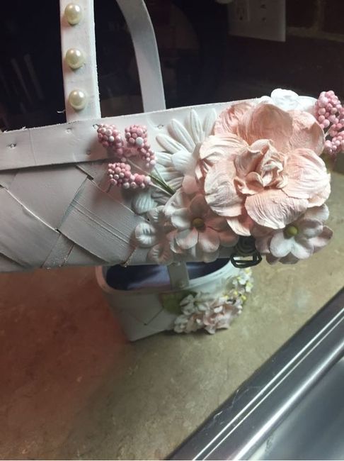 One of the worst sticker shock moments I had was shopping for flower girl baskets! Most of the ones I came across were $40+ each, they were awkwardly tiny, and not very cute. So I decided to make my own! For $25 at hobby lobby I got everything to make these, took me about 30 min. I used: plain wood baskets, chalky finish white spray paint, flower and pearl adornments from the scrapbook section, a little silk material, and hot glue. Our colors are light pink and dark gray so I just incorporated them slightly in the flowers and the basket lining. Here is the before pic of the baskets...finished product below!