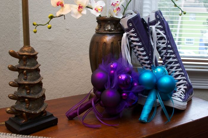 We made Christmas ornament bouquets -- the picture shows mine and one of my BMs. My MOH had a purple top ornament instead of just the turquoise.