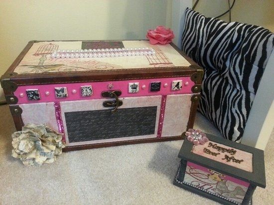 I bought a super ugly vintage small suitcase for $3.00 (!) and cut a hole on the top and modge podged vintage scrapbook paper and embellishments on it! I also made a few paper flowers and added the pearls to it. I love it and it goes with my theme and total price was like $8.00!