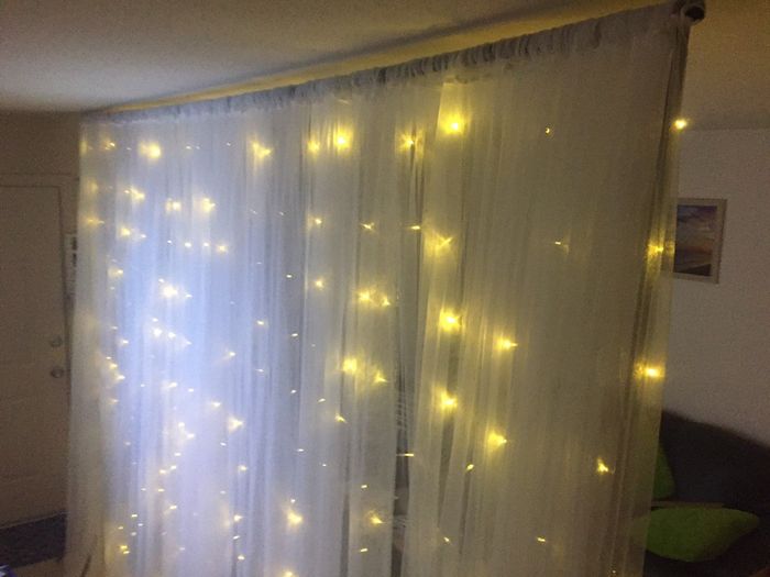 I used 6 Ikea Lill drapes and attached the curtain lights with safety pins. I managed to find 4 new drapes at Goodwill, but otherwise this setup runs $80. If you were to rent a frame and drapes from a company, will be at least $100.