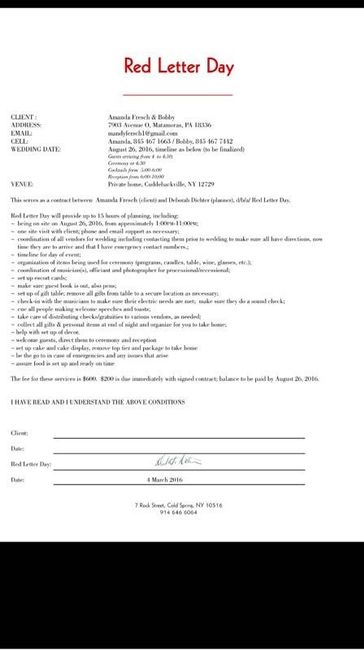 So we received the contract from the doc we met with. First off, they didn't list all the "duties" so I had to email them and ask they include the things we agreed upon as the contract states if it's not listed it will be subject to an extra charge. Second, & I need your guys help with this- I'm having a hard time understanding the wording.. Either I'm dense, or this contract (section c) is stating that they won't refund my money if they don't show up for the wedding. It does state they will make every attempt to send a replacement, but I still feel like the final line is saying even if they don't that they aren't liable. I did email them and expressed my concern and she had emailed back saying that we would be refunded all payments except for the deposit because that holds our date. While I understand it holds our date, they aren't technically "holding our date" if they don't show up and wouldn't have made money with another couple if an act of God occurred forcing them not to show.