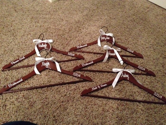 So excited they turned out so good! I'm not very crafty and hate my handwriting so I ordered these name/title/date vinyl decals on etsy and bought the hangers for 5/$5 at walmart! The ribbon is from michaels. The most irritating thing was the ribbon! It is hard to make a perfect bow. This will be a great addition to my bridesmaid gift bags!