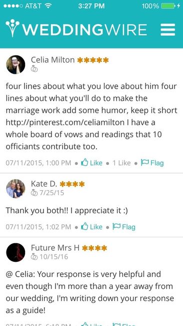 Anyone is welcome to share their advice, but I'm hoping Celia will see this and help me out. We're writing our own vows, and awhile back I think Celia gave some kind of formula for writing vows. Something like 2-3 sentences on what you love about FS and 2-3 sentences on what you promise FS in your marriage. Does this sound right, or was there another part I'm missing? I'm going to use an example I found online, but FH is writing his own so I wanted to share some tips with him that I found while looking.