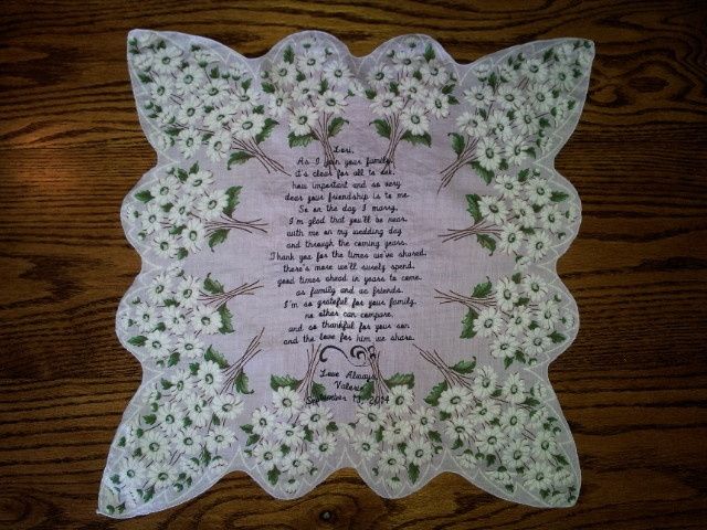 Hi guys! I have NO IDEA what I'm getting for our parents. I was thinking those pretty embroidered handkerchiefs for each of them but I don't know. And is the gift from both of you? Because if I do the handkerchiefs, it's hard to word it like it's from both of us.