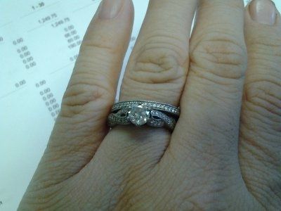 FH and I went to go get my wedding band. It's been a an adventure since my engagement ring band is shaped funny. So I picked out a straight band and liked it. FH said I could pick what I wanted but that he didn't care for the gaps. We went to several stores and tried on tons of bands and it seems the only way to keep the gaps away is to have a custom band made. I really rather not. ANYWAYS we bought the band and the more I think about it the more I think about what he said. I love the ring, do you think it looks ok? Oh and I know that the band goes first this was my way of trying it on without breaking too many rules about wearing your ring before your married lol.