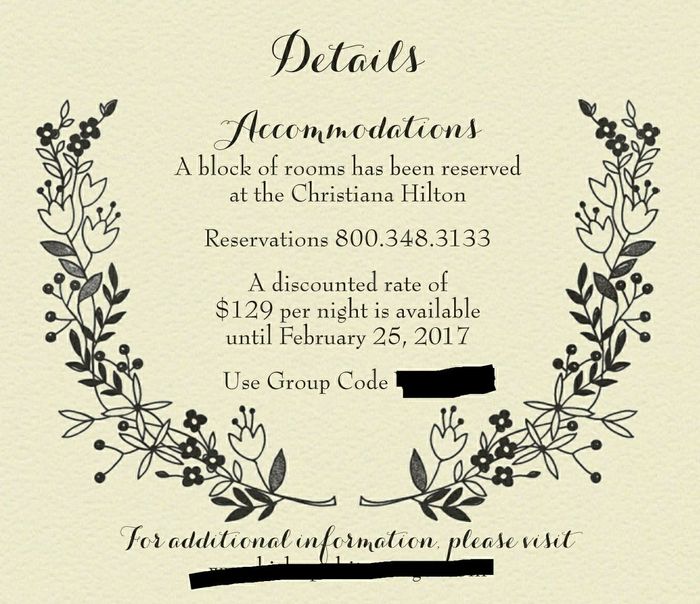 Can anyone send me an example of their or of a hotel accommodation invite. And/or of just listed local hotels. We are in the process of doing the hotel blocks but I also want to list a few other local hotels in different price ranges. I have a handful of OOT guests that have never been in S Fla so I'm adding local fun spots to their invites. Just not sure how it's all worded. Thanks!