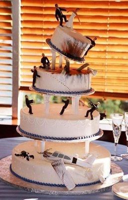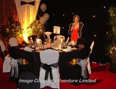 My fiancé insist in us having a James bond wedding theme, witch I loved at the beginning but now I don't know how to create it, except an Austin martin car, everyone in nice tuxedos and have martinis as a main drink what else can I do? I have no idea what color scheme to use, what centerpieces, in what color to dress my bridesmaid and not even how should my wedding dress to be? ? Anyone has any suggestions or ideas?