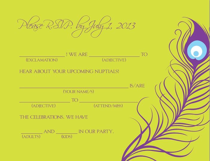 I want our RSVPs to be more memorable than the traditional wording. Our families aren't too happy about having to RSVP so I figured maybe if we make it more fun it would make the process more smooth. I saw this idea on Pinterest (of course) and decided to play around with it). Here is what I have come up with.