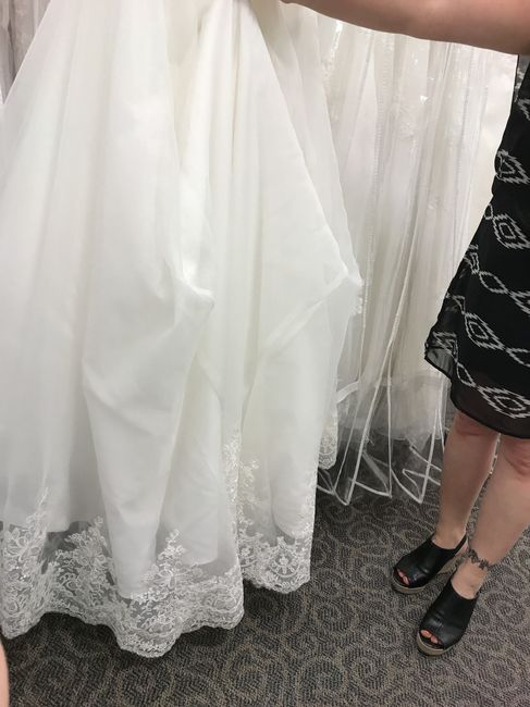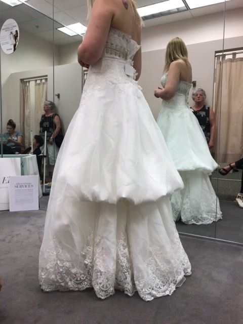 So, I had no idea that I might need to research bustles before going into my first alterations appointment. Then I went in and they showed me two different options for my bustle and both of them were AWFUL. I only have one set of pictures for the one style. But the other one kind of poofed out like peacock feathers. Can someone please help me and tell me where this is going wrong, give suggestions? Maybe by the grace of God, someone else might have had the same dress as me and has a picture of their own bustle? It’s from David’s Bridal – WG3838. It’s an organza A-line dress with a chapel train. So for now they are holding off on the bustle while I look at options. My wedding is in 38 days. See attached pictures.