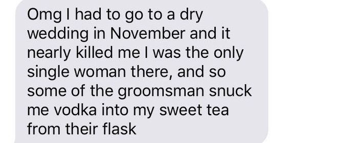 Also, my mom (who rarely drinks) told me she snuck vodka into a family wedding recently. It really does happen. And I would never want my wedding to be described as "it nearly killed me".