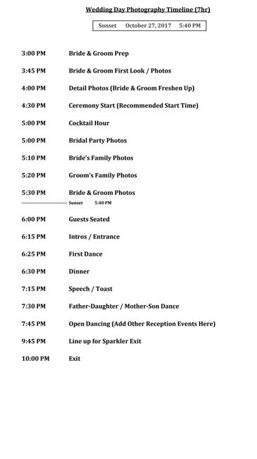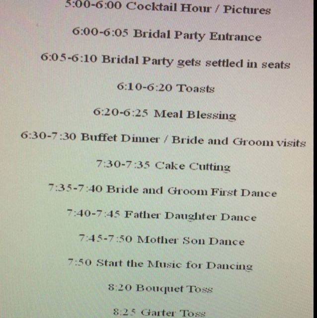 Does anyone have a list of the events and timeline for when they should occur (bouquet toss, garter, cake cutting, father/daughter dance, first dance)? Trying to plan. I do not want to stop in the midst of partying to do these items. Should I do them all first and then get back to the fun?