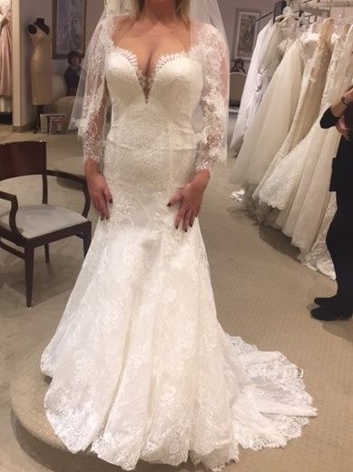 My Enzoni Blue wedding dress came in that I said "yes" to back in February Originally I wanted a Maggie Sottero or EOA, but tried this ivory lace mermaid gown on with an illusion back and lace sleeves and fell in love. It was 2 sizes too small, but looked pretty good (though I couldn't move), so we ordered my true size. Well when I went to see it and put it on this weekend I was in tears, and not happy ones.