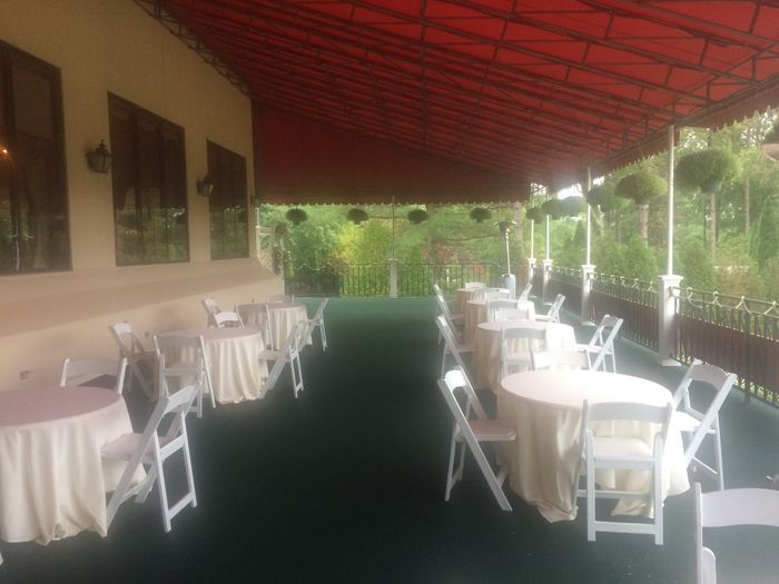 I need some ideas on how to decorate the terrace. It's really just an "extra" space that people can use to get some fresh air, and just have an extra space to socialize. It's set up with tables and tablecloths and hanging flower baskets and rope lighting around the perimeter. We are trying to stick to a tight budget, so we will be making our own centerpieces (probably submerged flowers) and will have a few flower decorations in the main reception area. I don't want to leave the terrace ignored, but don't want full centerpieces out there on each table either. So I'm looking for some cheap, easy ideas that we can use to decorate so that the space doesn't look ignored. I've attached some pictures of the space so people can see what it looks like.