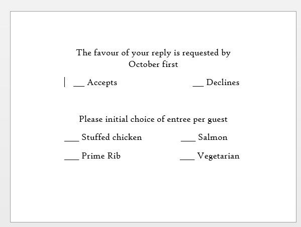 Are your having or did you have a sit down dinner for your reception? How did you word the RSVP? I don't why but I keep getting pretty frazzled with trying to word my RSVP. I know I do want the " X seats have been reserved in your honor". But how do your word the options of food guests have to choose from? I know it shouldn't be this hard but I think I'm over thinking it wayyyyyy to much!