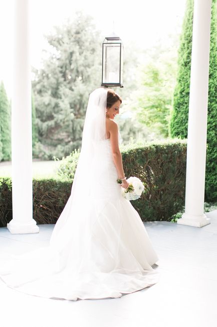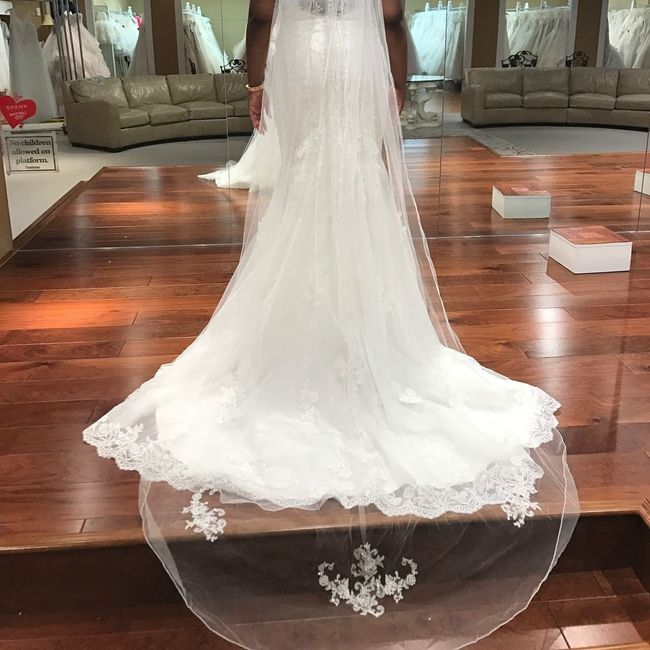 I'm trying to decide on my veil. I'm planning to go through Etsy so I wont have the ability to try it on before ordering. I'm stuck between a floor length 6ft long veil and a 7.5 ft long chapel veil. My dress has a long train but I don't want a longer veil than dress. anyone has or had a veil that touched the ground but didn't extend as far as the full train of your dress? pictures are awesome