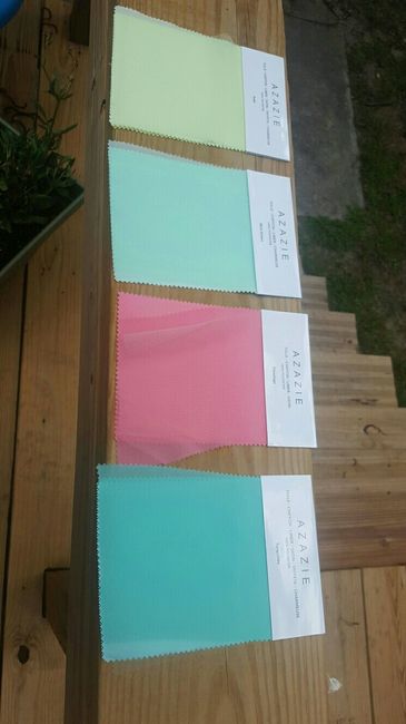 Got my azazie swatches in the mail and I'm still not much closer to choosing a BM dress color lol. I may need to order a few more just to be super sure...or maybe I'll just order the sample dresses in the other colors I'm curious about. Def like the turquoise and mint green. Anyways, I'm super happy with Azazie so far!