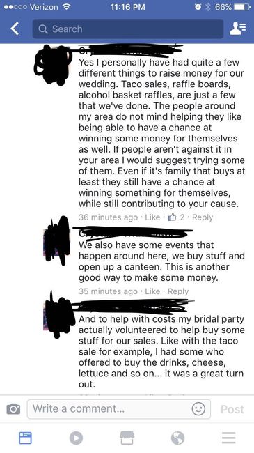This was a response to whether or not it was appropriate to start a GoFundMe for wedding expenses since families weren't apparently fronting it for them.