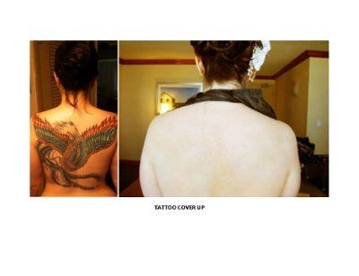 I have a huge back tattoo, and would like to have it covered up for my wedding (I just think it would be classier not to have it show). I have heard tattoo camo works to cover up, but am concerned because of the size of my tattoo, it's brigtly colored and goes from just below where a crew neck tee shirt would sit to mid thigh.... I think it would take multiple bottles to cover it up, and I would be so sad if it rubbed off to my wedding dress.