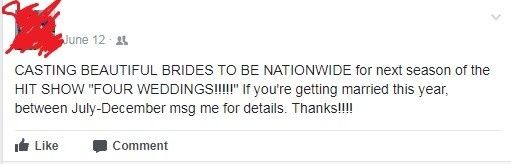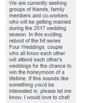 A casting director reached out to me (after seeing my wedding wire website) about possibly being included in the show, Four Weddings.