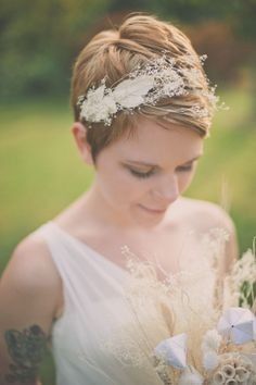 As you can see from the picture, I have a pixie cut, which makes finding the right headpiece pretty difficult. Headband? Blusher? Veil? Just a flower? Not really sure. Any ideas?