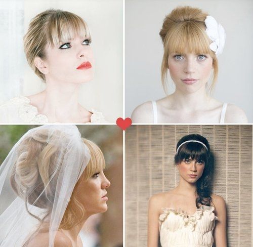 I've been having a hard time finding wedding hair ideas with straight across bangs. Has anyone seen any really cute pics of hairstyles (updo's, downdo's, and half up half down)? Any ideas as to where to look or pics would be great!!