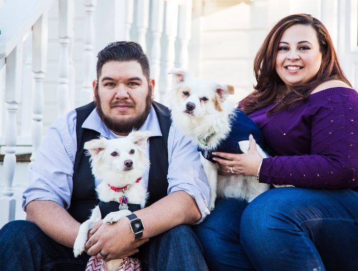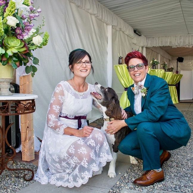I am dying to have a couple pictures with my dog when I'm in my wedding dress. My FH doesn't want any because he is worried about dog hair so I was thinking about just taking a couple with me before the first look. Has anyone done this or planning to do this? I'm a little bit worried about her accidentally ripping the dress because my dress has a very delicate outer tulle layer. Any advice or suggestions?