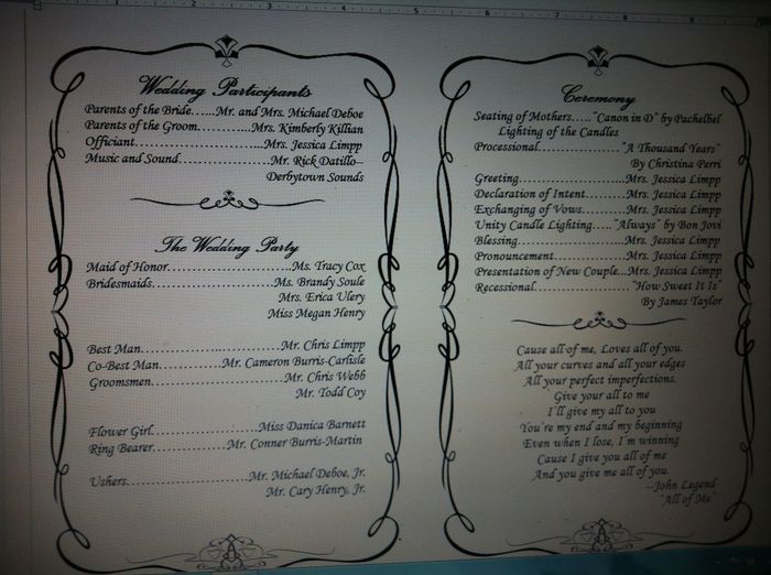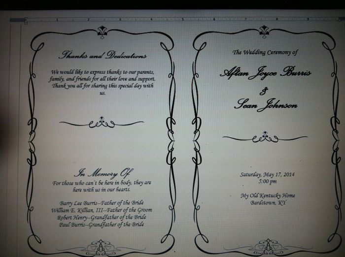 Also, we are having a non-traditional non-religious wedding - on the program should i list the schedule of how things are happening - ie: seating of grooms parents; seating of mother of the bride; bridal party procession; welcome; reading of ----; (not sure what to call what to call this part where the officiant talks about us - its not a "homely"); reading of ---; exchange of vows & rings; the KISS; PARTY TIME!