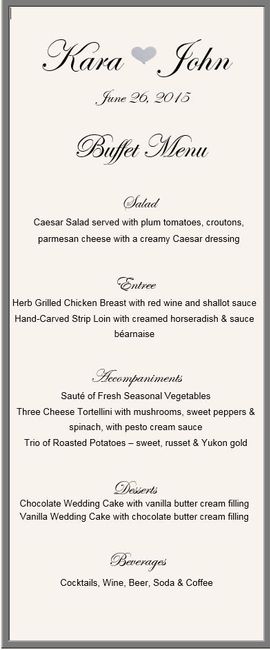 My FH and I have chosen to do a family style meal for our guests. With the family style the guests have courses; Course one: bread, soup, and salad Course two: a sorbet (to cleanse the palate) Course three: chicken, filet, and lasagna rolls Course four: (accompanying course three) roasted vegetables, mashed potatoes, and green beans. Course five: After dinner the guests will then have a dessert table for options as well as wedding cake slices. Now, since we will not be having plated service we will not ask the guests to choose their meal options beforehand. In saying all of this, should we design "reception menus" to place on the guest tables at each place setting? I think that if I were a guest at my wedding I would prefer to have a menu. What do you think?