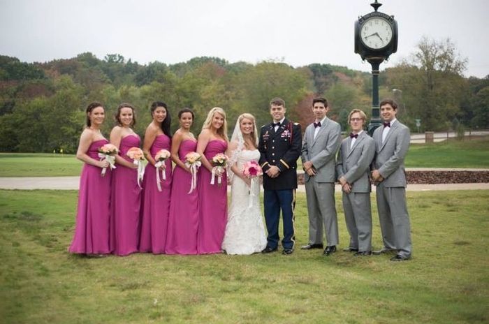 Hey everyone! I'm needing some help here. My fiancé is in the Army, and when asked what he wanted to wear to the wedding, he said probably his dress blues. I'm wearing my wedding dress, obviously, that's a trumpet-style fitted dress; pretty classy looking as well. For my bridesmaids, I had decided that they should just wear plain, pastel dresses, or even simple, small floral prints. I want it to be fairly casual without so much matchy-matchy. I want this to be like Steel Magnolias where everyone is more concerned with the joy and fellowship and not so much the uptightness that sometimes comes with it. With this in mind, I don't know what the groomsmen should wear! Some are in the military and some aren't. I think it should be their preference if they want to wear their dress uniforms. (To me, that's an honor to have them there with us!) For the other guys, what would they wear? Since my girls are dressed-down some, I don't know what to do here...